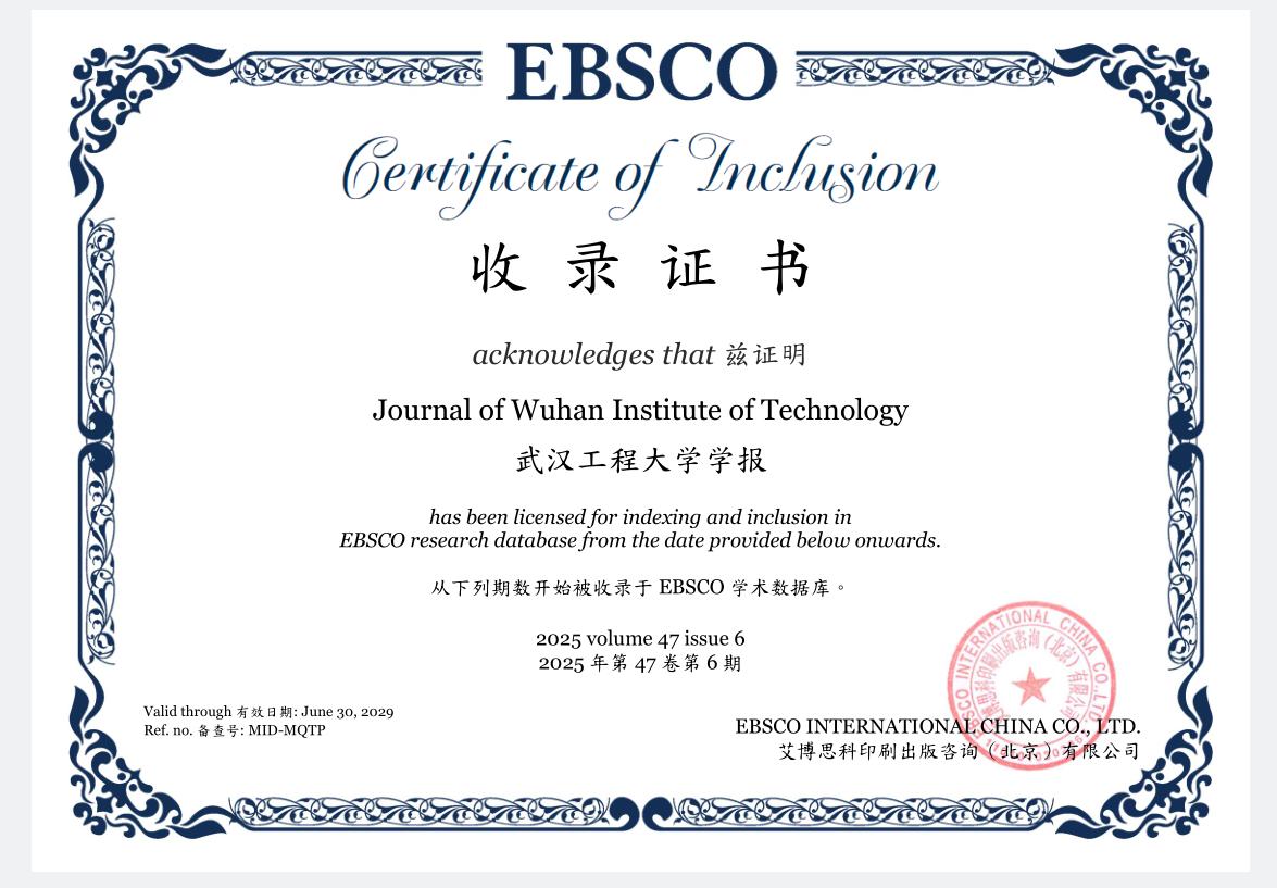 (本网讯 通讯员 张媛媛 张瑞) 近日,我校主办的《武汉工程大学学报》(以下简称《学报》)喜获国际权威学术数据库EBSCO收录证书,确认自 2025 年第 47 卷第 6 期开始《学报》所有正式发表的学术文献均被EBSCO数据库索引收录,并同时向全球传播。《学报》入选EBSCO数据库,再一次在国际权威学术平台展示了我刊的学术出版质量,是《学报》国际化进程的重要突破。